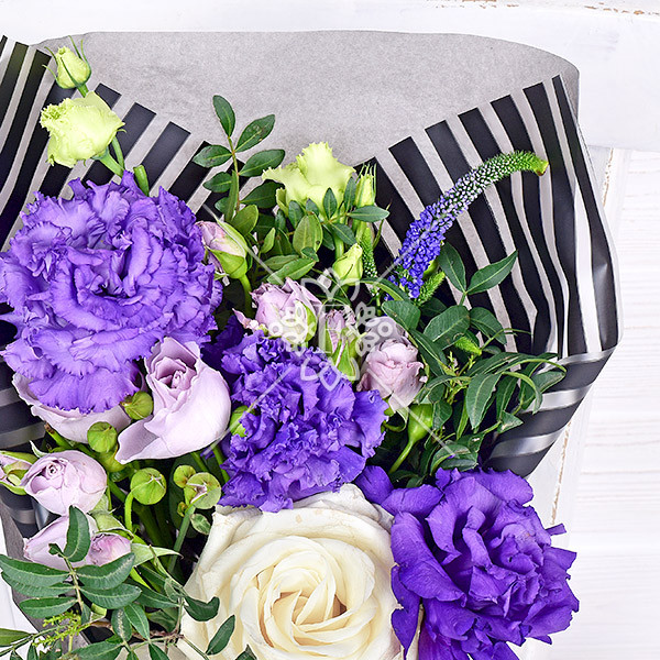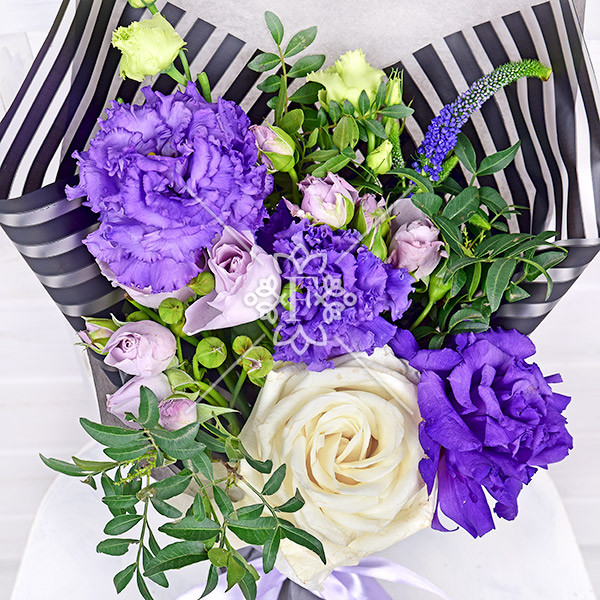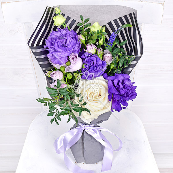 Роза фиолетовая кустовая – 1 шт., эустома фиолетовая -1 шт., роза белая -1 шт., декоративная зелень (фисташка,вероника), упаковка, лента.
