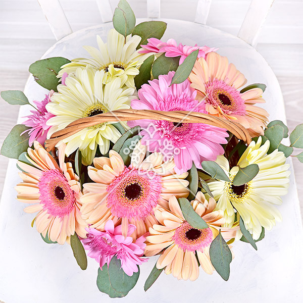 Невероятные герберы  розового, кремового и персикового оттенка в сочетании с зеленью эвкалипта выглядят совершенно. От композиции в цветочной корзинке невозможно отвести восторженный взгляд!