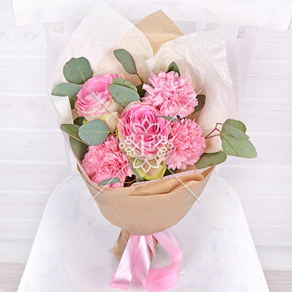 Роза розовая – 2 шт., гвоздика розовая – 3 шт., эвкалипт – 1 шт., упаковка, лента.